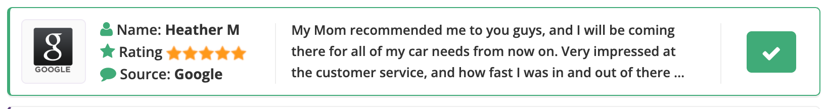My Mom recommended me to you guys, and I will be coming there for all of my car needs from now on. Very impressed at the customer service, and how fast I was in and out of there. Reasonable prices as well